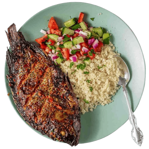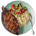 Seasoned atcheke (or fonio) grain topped with a choice of two protein and plantain included. With a side of diced seasoned veggies.