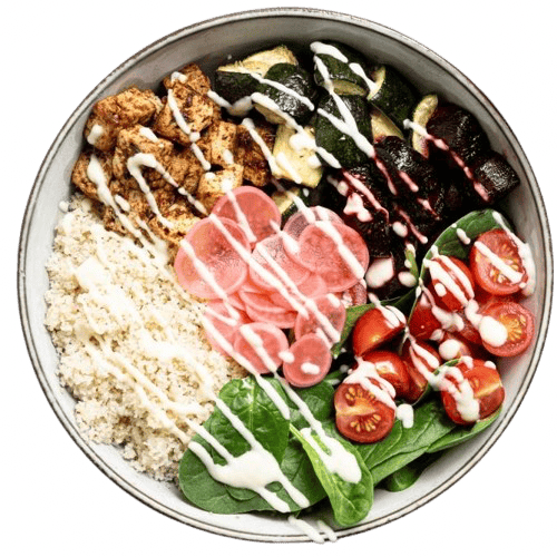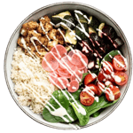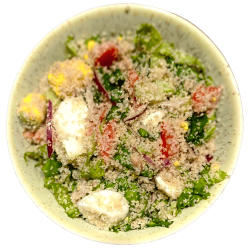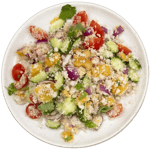 A perfect balance of grain and greens mixed in with cucumbers, tomatoes, onions, house seasoning and sardine based dressing.